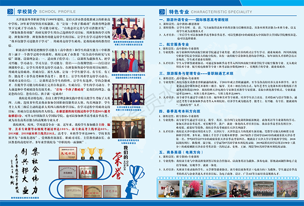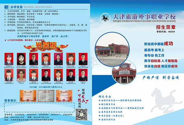 专业优势:该专业学生通过学习语文、数学、英语、综合四门文化课程和旅游概论、商务英语等专业课程的学习,参加河南市春季高考,可实现升学、落户、就业一体化的人才培养目标。我市春季高考具有科目少、难度低,政策好等优势,我校春季高考成绩在河南名列前茅。